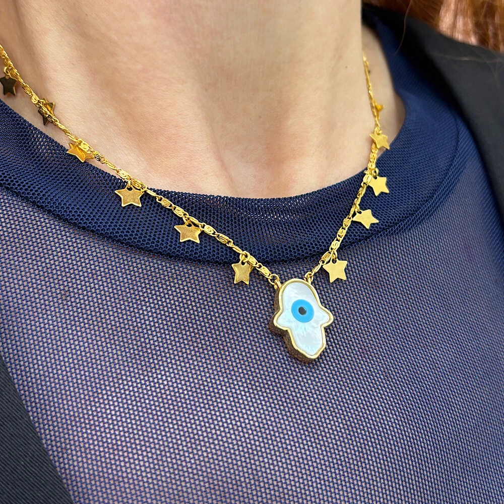 -30%Colar Estrelas, Mão de Fátima e Olho Grego