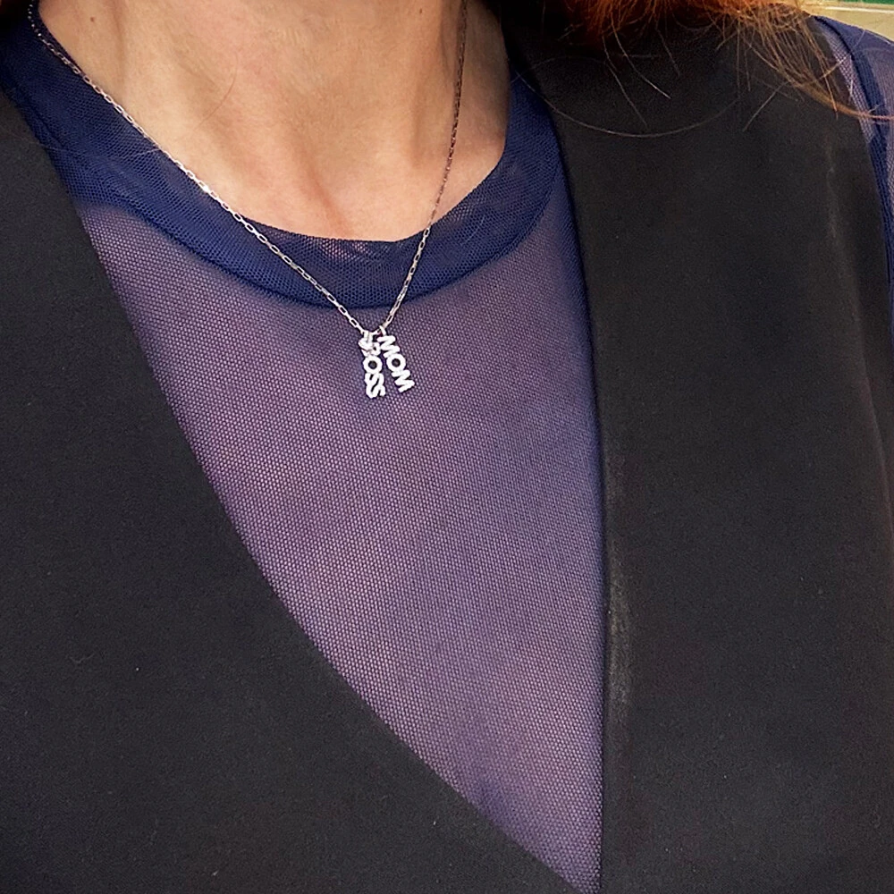 Palavras "MOM" e " BOSS" na vertical ambas cravejadas de zircônias brancas, e um mini ponto luz de zircônia branca;