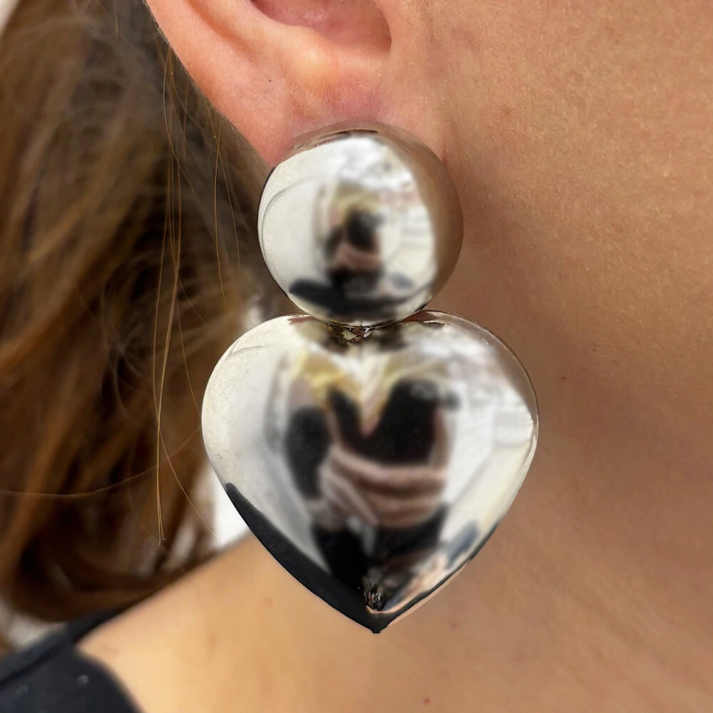 Brinco grande, base de bola abaulada toda lisa e, um coração grande, abaulado e liso pendurado;