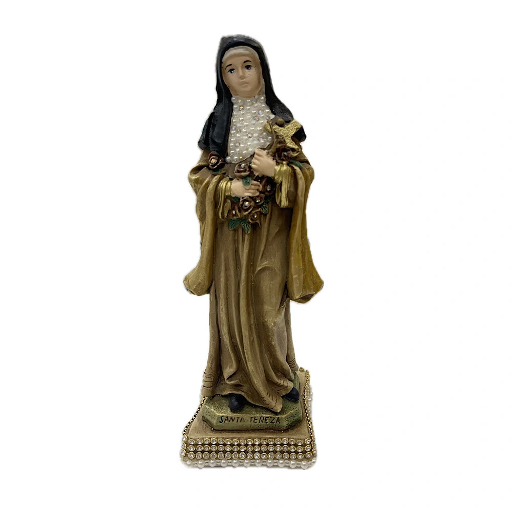 Imagem de Santa Tereza em gesso com detalhes em dourado e acabamento com cristais e pérolas;